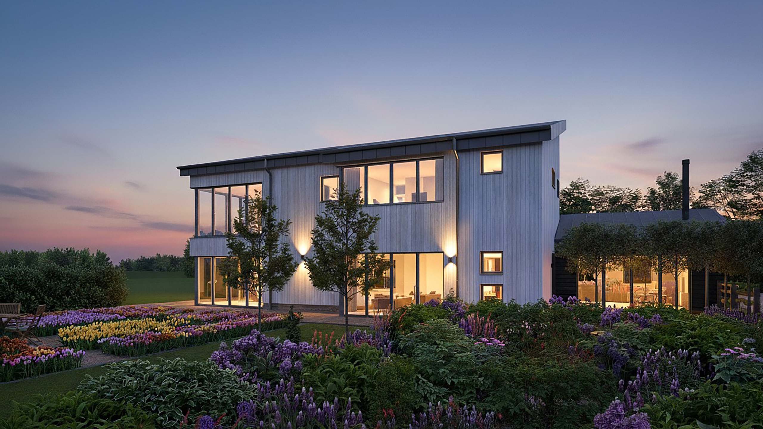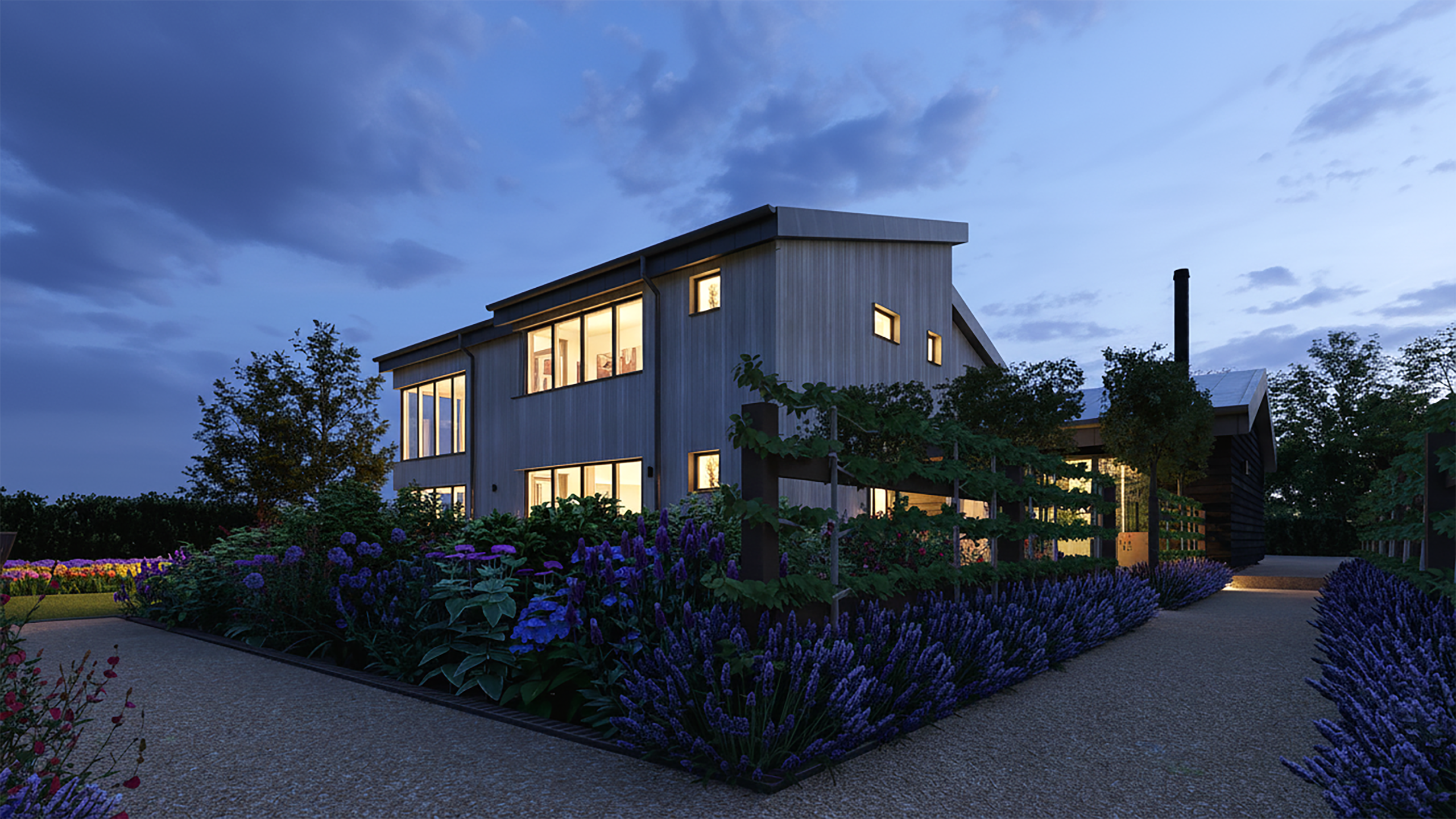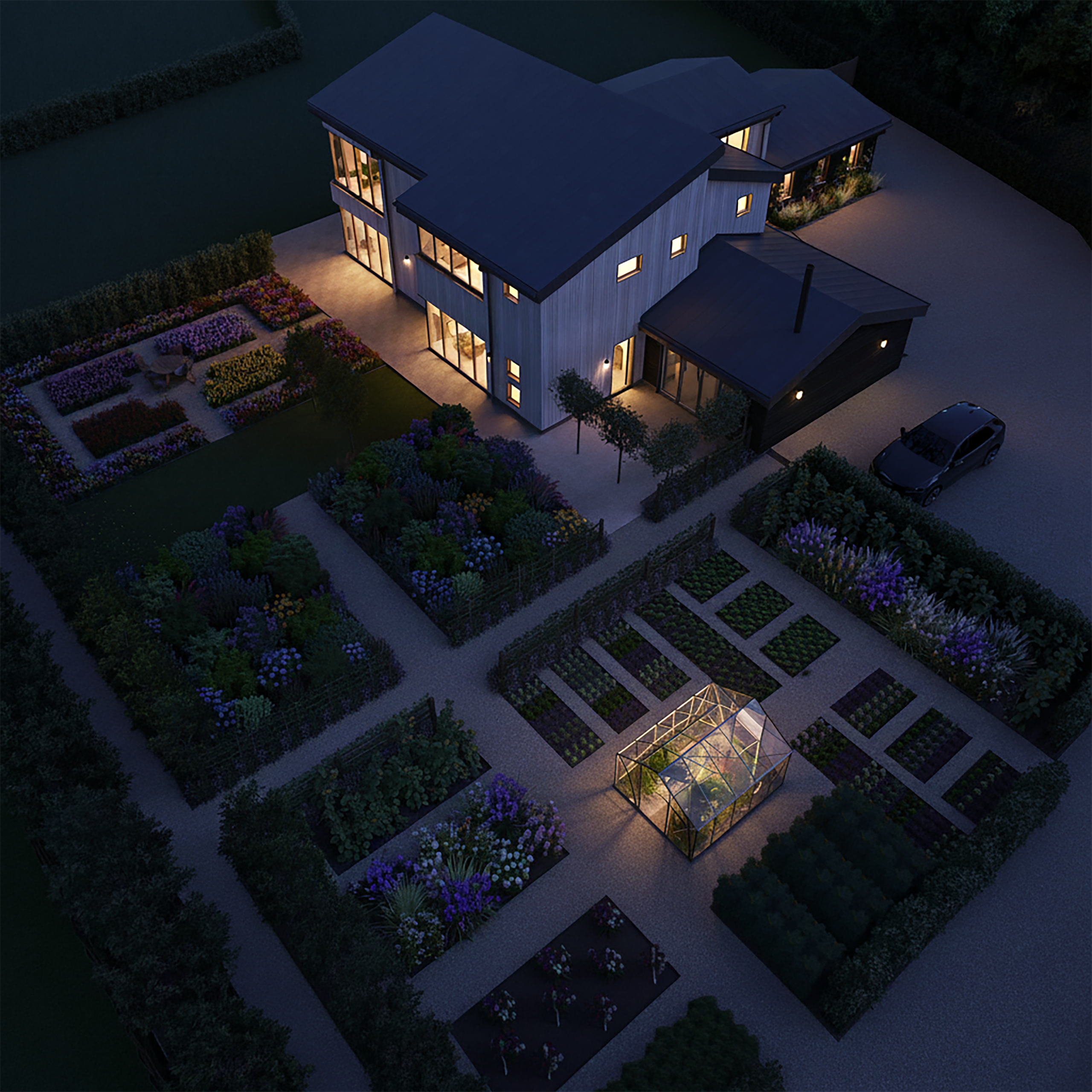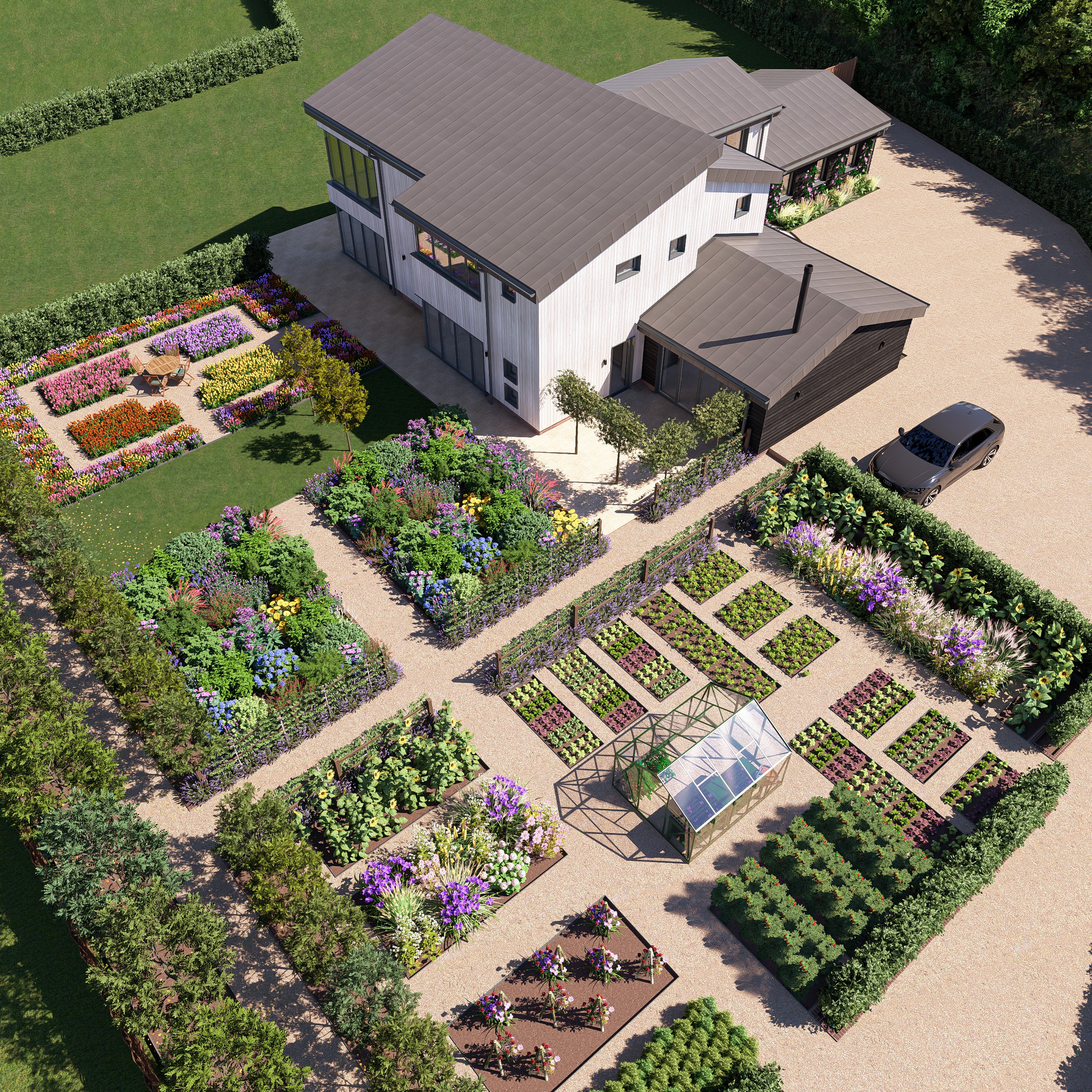 The transformation continues outdoors with a carefully considered landscape design. Structured kitchen gardens, vibrant perennial borders, and colourful seasonal planting now frame the house, creating spaces that are both productive and beautiful throughout the year. Expansive terraces connect indoor and outdoor living, making the home perfect for entertaining and family life. The result is a modern, welcoming rural retreat that feels deeply connected to its surroundings.